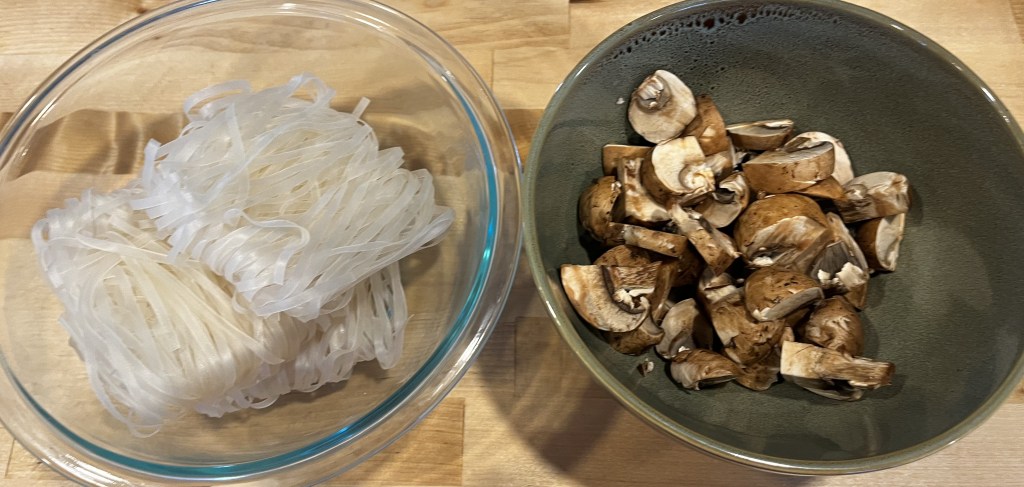 Since I am currently are not bringing in any income I’ve been focusing on making meals with refrigerator and pantry items. I learned long ago in college that you can make a one pot meal out of any 3 vegetables, a protein, and a sauce of your choice. Back then I ate low carb so thats how many meals were. Fortunately for tonight I found some rice noodles in the pantry in addition to pad Thai sauce. Onions, carrots, and mushrooms may be a unique choice for traditional pad Thai, but I’m always happy to use whats on hand.